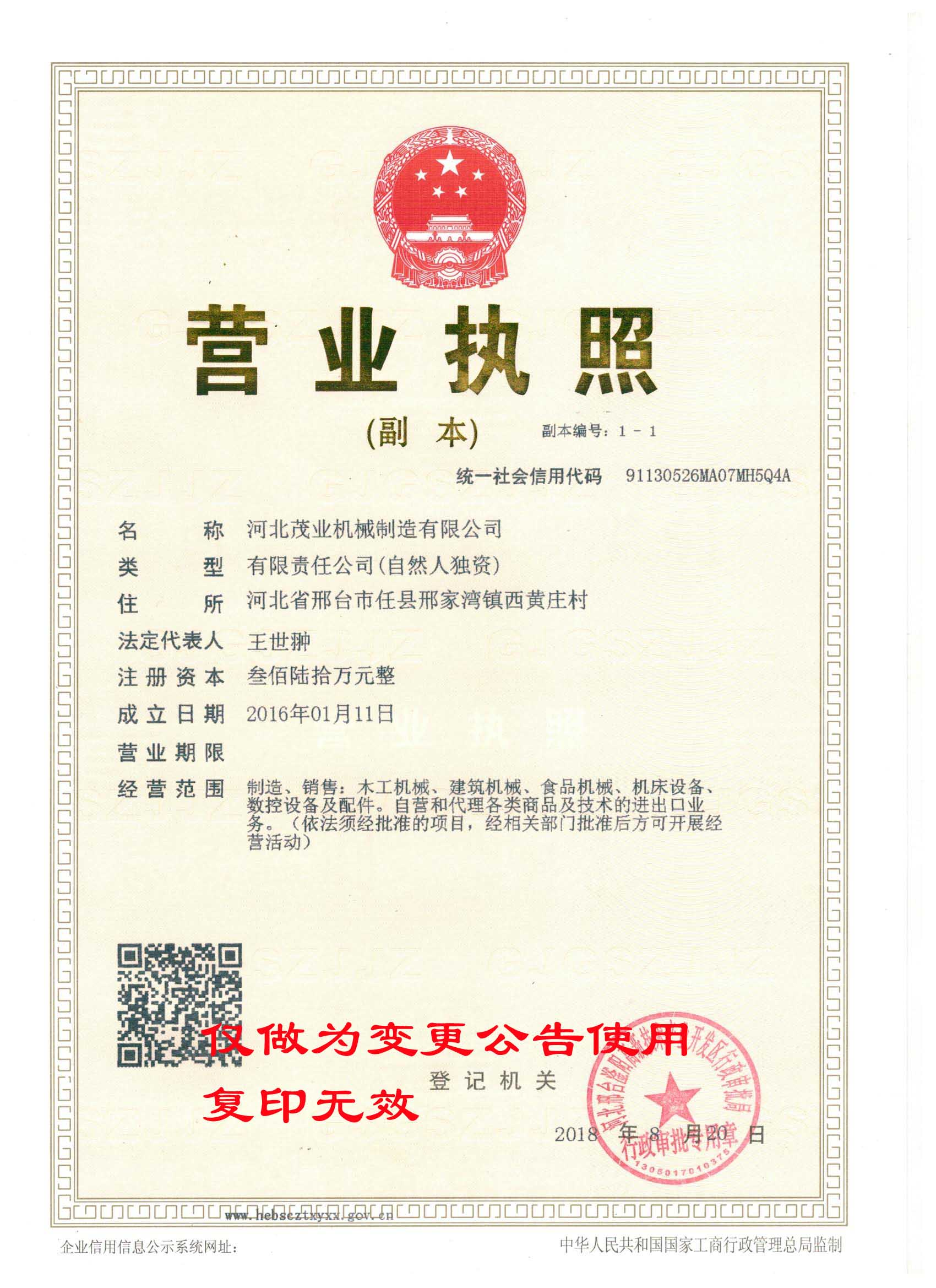 我司邢臺(tái)茂業(yè)機(jī)械制造有限公司,因公司業(yè)務(wù)發(fā)展的需要,現(xiàn)已整體變更為河北茂業(yè)機(jī)械制造有限公司,并于2018年8月20日取得河北邢臺(tái)滏陽(yáng)高新技術(shù)產(chǎn)業(yè)開(kāi)發(fā)區(qū)審批局頒發(fā)的營(yíng)業(yè)執(zhí)照?,F(xiàn)將有關(guān)事項(xiàng)公告如下: